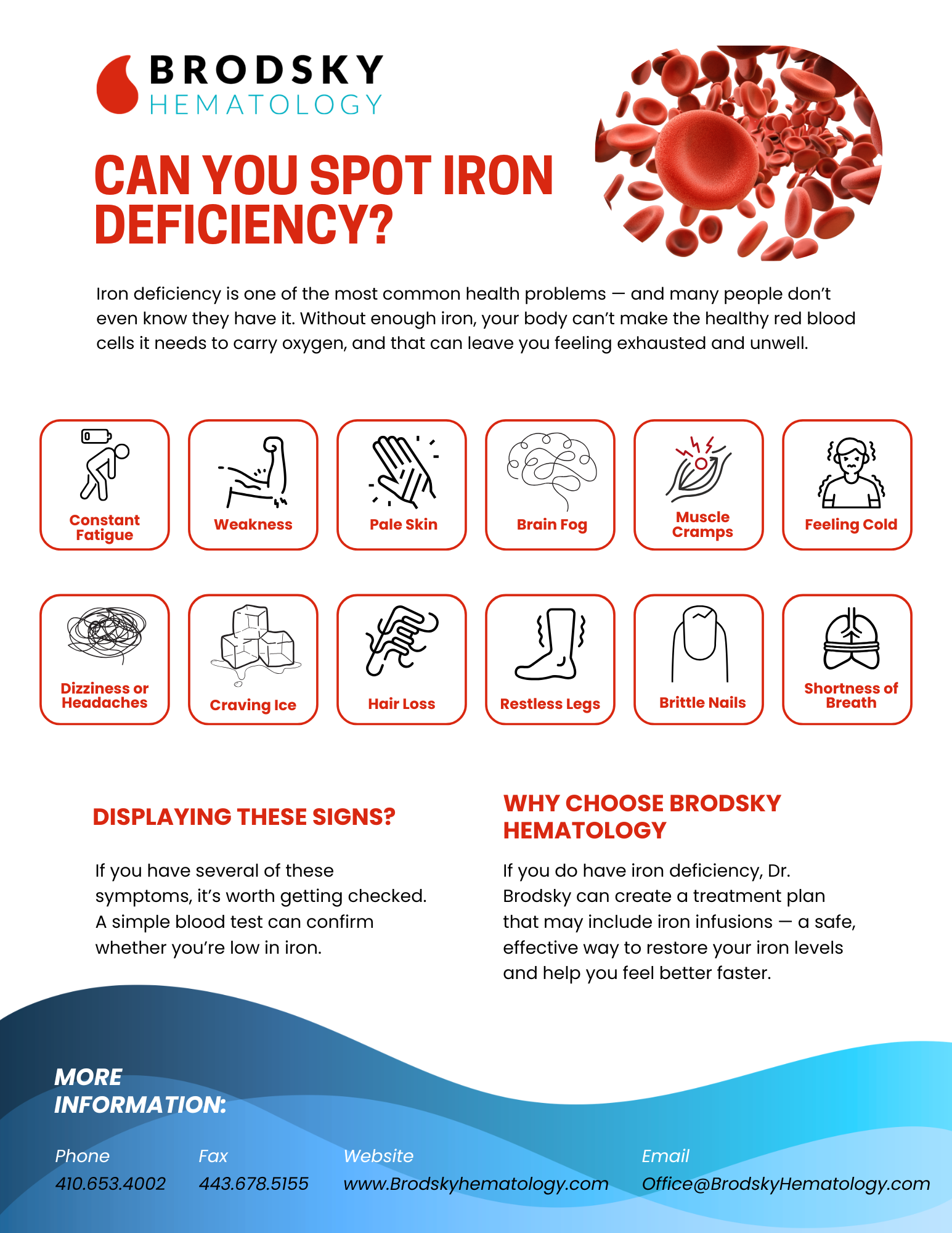 Brodsky Hematology is a private hematology practice specializing in the diagnosis and management of benign blood disorders. We offer expert care for conditions such as anemia, iron deficiency, clotting disorders, and low platelet counts, with a focus on patient-centered, personalized treatment.