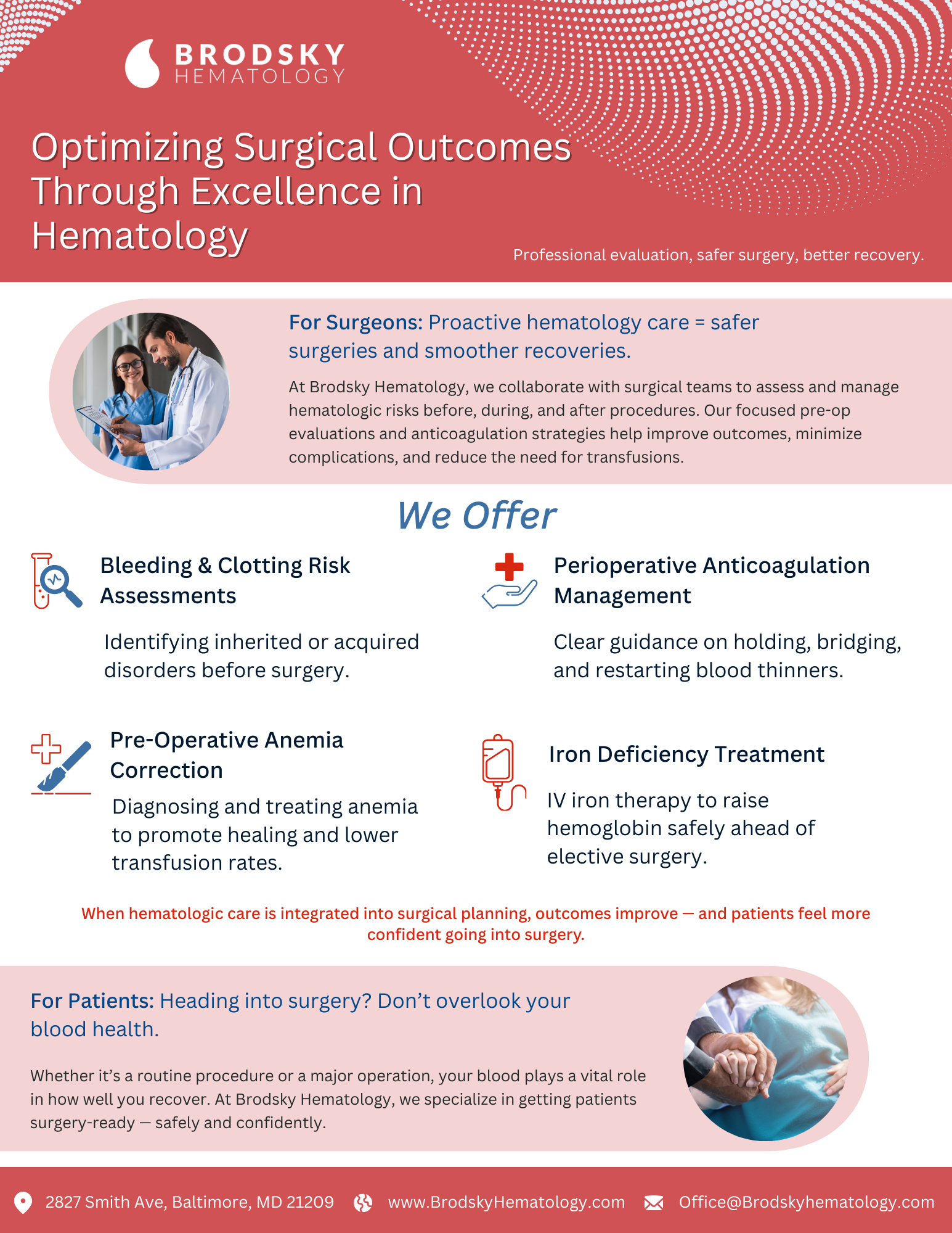 Brodsky Hematology optimizes surgical results by partnering with surgeons to preform professional evaluations, safer surgeries, and better recovery.